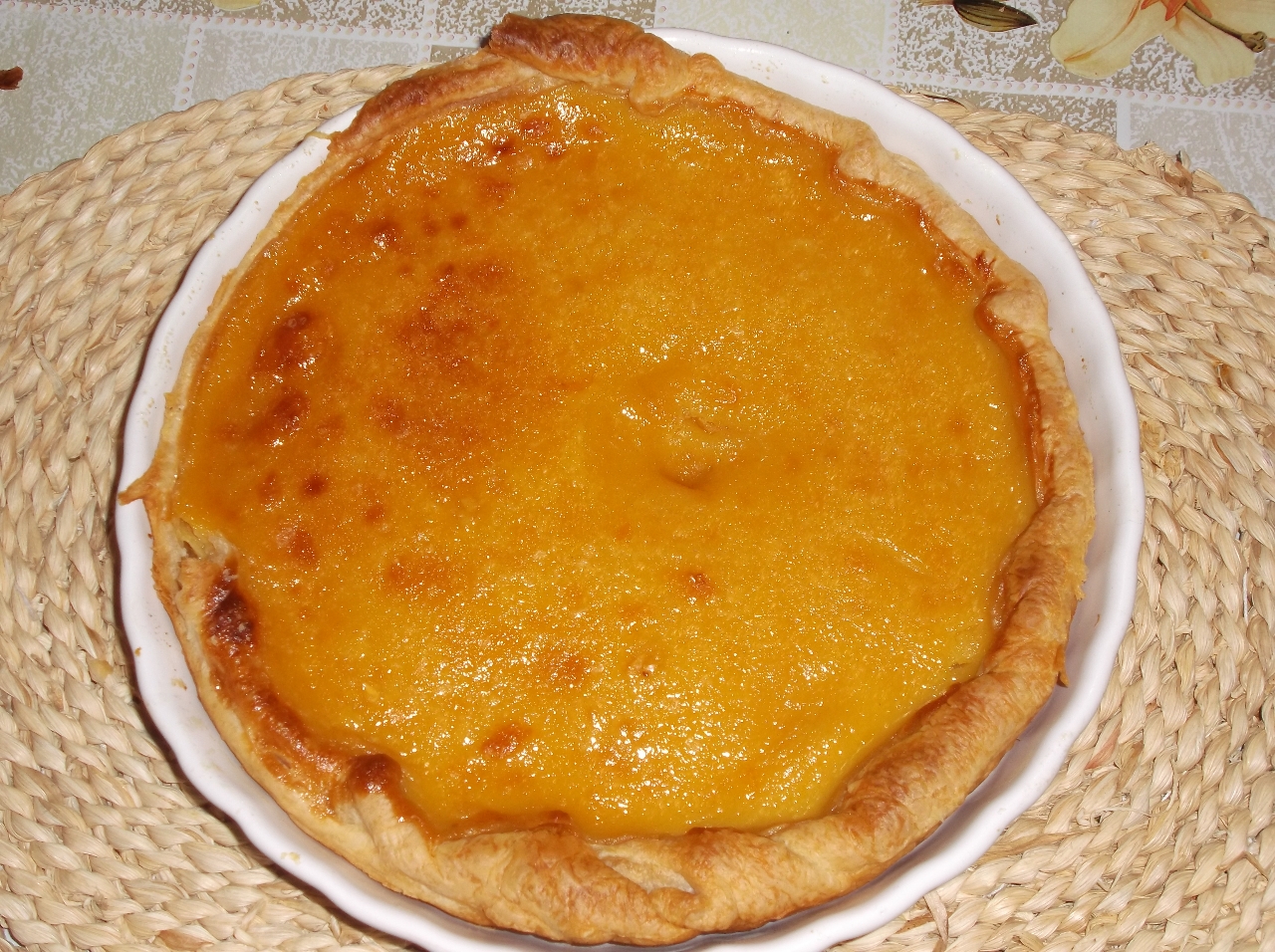 Colocar a massa folhada de compra em cima da tarteira, moldando à forma da tarteira e colocamos o creme que preparámos.